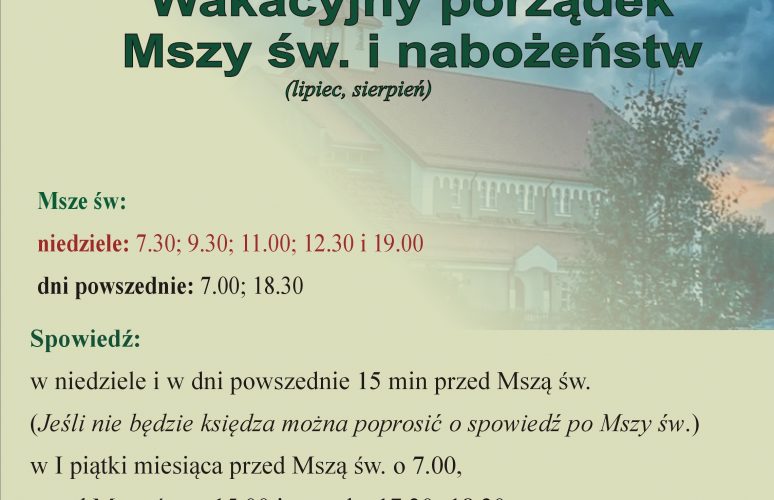 Przypominamy, że do końca wakacji w niedziele nie ma Mszy św. o 17.00. W dni powszednie Msze św. o godz. 7.00 i 18.30. Kancelaria parafialna w wakacje czynna w poniedziałki od 19.30 do 20.30. W pilnych sprawach zapraszamy po wieczornych Mszach św. Spowiedź w czasie wakacji 15 min przed Mszami św. Nabożeństwa w okresie wakacyjnym: …